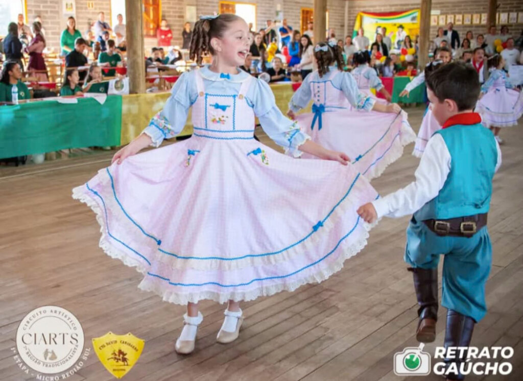 Com muita dedicação, estudo e amor pela cultura gaúcha, Júlia conquistou o 5º lugar na categoria Mirim. A seleção das prendas incluiu diversas etapas: prova teórica sobre a história, geografia e cultura do Rio Grande do Sul, mostra folclórica com o tema “brinquedos e brincadeiras da natureza”, além de provas artísticas, como prova oral, declamação e danças tradicionais. Durante essas apresentações, Júlia foi acompanhada pelo peão Tiago Timbola.