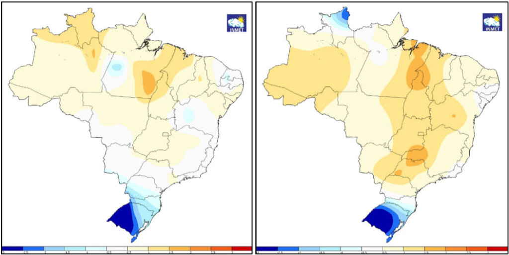 Durante a estação, a atuação de massas de ar frio provocou quedas acentuadas na temperatura mínima, especialmente em áreas do sul do Mato Grosso do Sul, centro-sul do Paraná, Santa Catarina e Rio Grande do Sul (tons em azul – Figura 2a). Entre os dias 24 e 25 de junho, uma forte onda de frio atingiu as regiões Sul, Sudeste e Centro-Oeste, resultando em temperaturas mínimas negativas no Sul. Destaque para a estação meteorológica de General Carneiro (PR), que registrou –7,8 °C no dia 25 de junho. Nesse período, também foram observados episódios de geada forte e ocorrência de neve em Pinheiro Machado/RS.