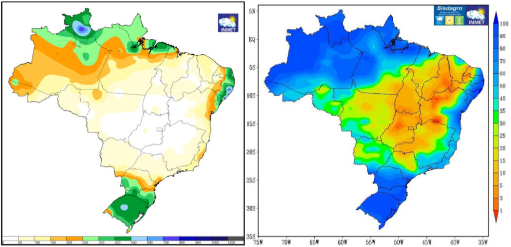 Em contrapartida, o interior do Nordeste, grande parte do Centro-Oeste e do Sudeste apresentaram volumes inferiores a 200 mm (tons em laranja e amarelo – Figura 1a), refletindo em níveis críticos de armazenamento hídrico no solo (abaixo de 15%), especialmente no nordeste do Mato Grosso, Goiás, oeste de Minas Gerais, noroeste de São Paulo, Tocantins, Maranhão, Piauí, Ceará, bem como o oeste dos estados do Rio Grande do Norte, Paraíba, Pernambuco e Bahia (tons em laranja na Figura 1b). Níveis intermediários de umidade do solo, foram observados em parte de Rondônia, Mato Grosso e Mato Grosso do Sul. Ressalta-se que durante o inverno, é comum ocorrer a redução das chuvas.