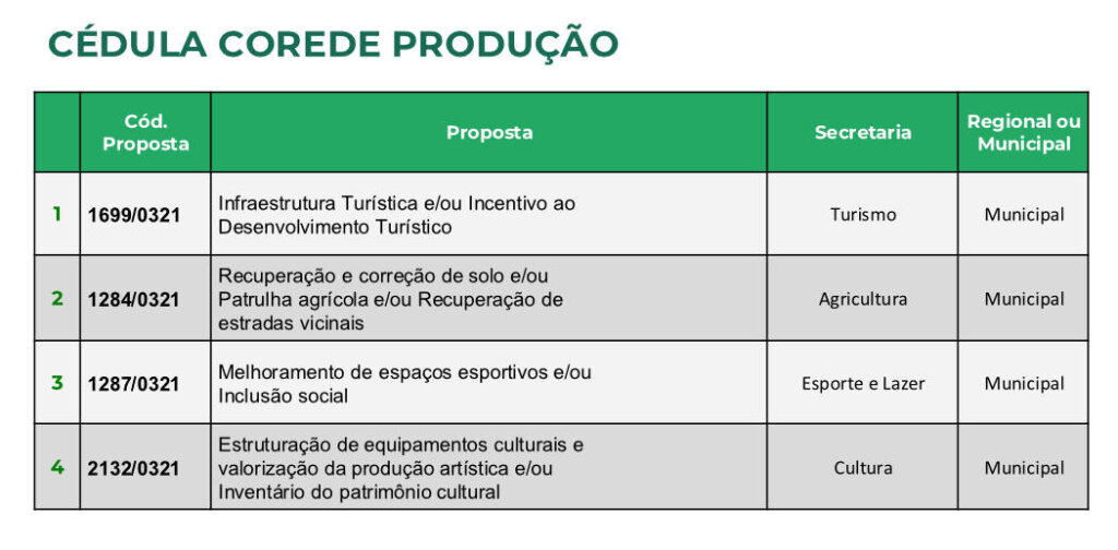 As propostas disponíveis na votação foram definidas pelas regiões durante as Assembleias Intermediárias e Ampliadas, com base no Caderno de Demandas Elegíveis. O processo é coordenado pela Secretaria de Planejamento, Governança e Gestão (SPGG), em parceria com os Conselhos Regionais de Desenvolvimento (Coredes). Veja a cédula para os municípios da região de abrangência do Portal JH: