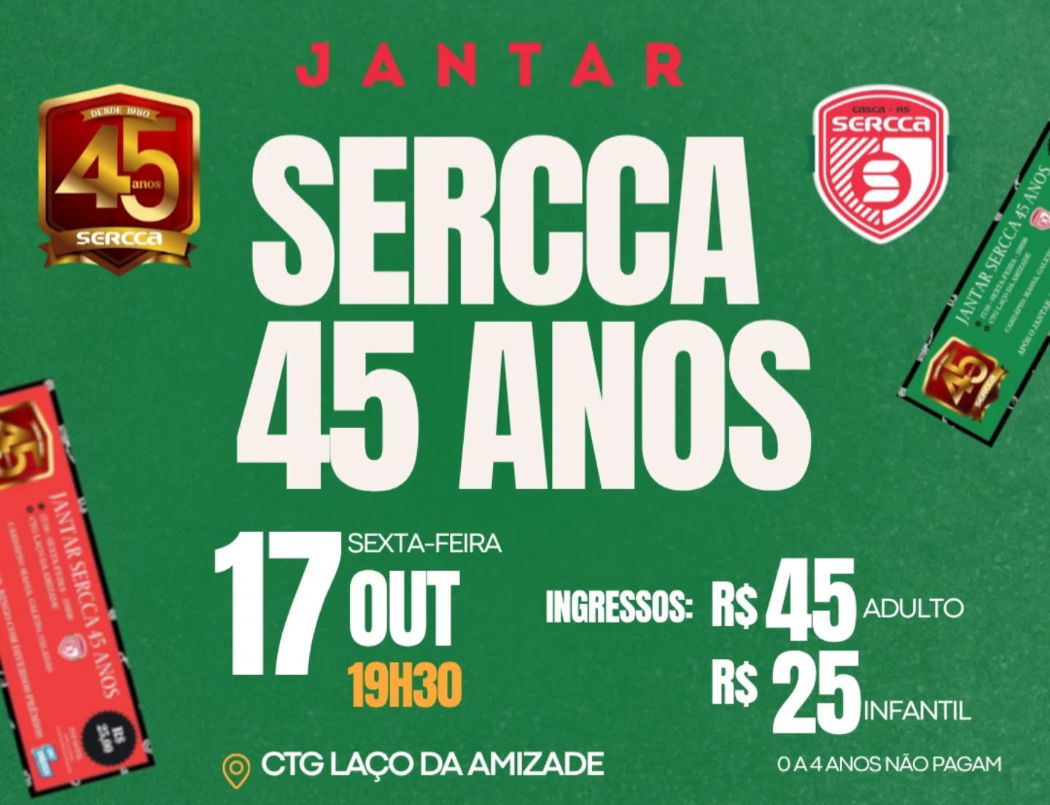 O SERCCA celebra seus 45 anos de fundação com um jantar comemorativo nesta sexta-feira, 17 de outubro, a partir das 19h30min, no CTG Laço da Amizade, em Casca. O evento marca mais de quatro décadas de história, conquistas e paixão pelo futsal no município.