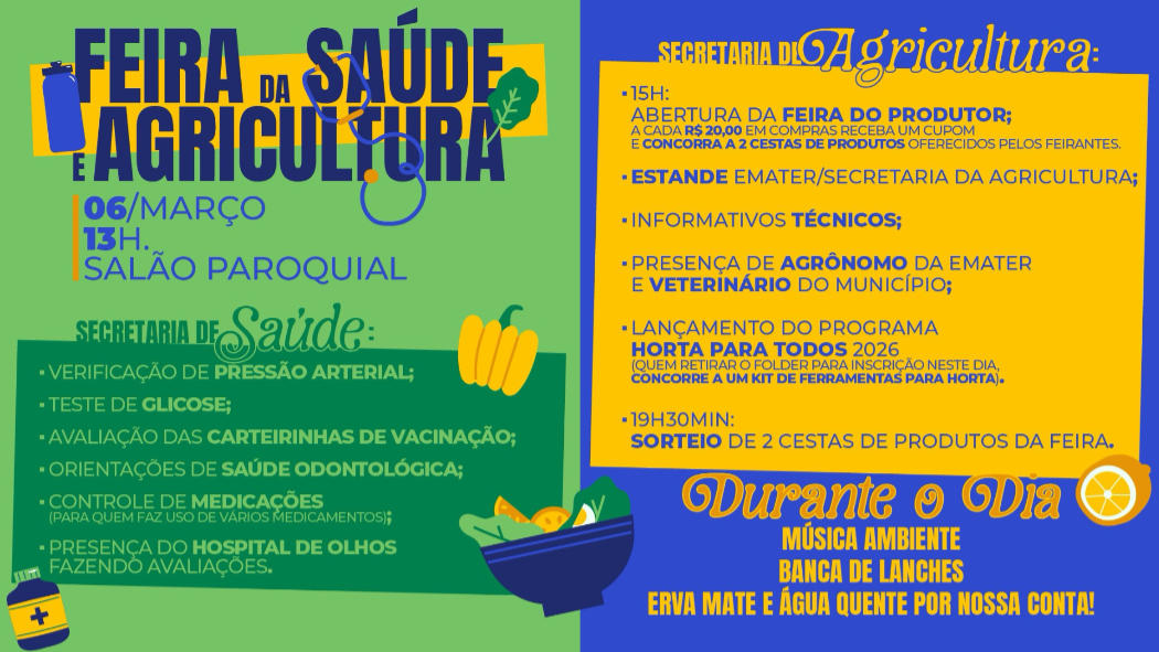 As Secretarias de Saúde e Agricultura de Santo Antônio do Palma promovem, na sexta-feira (6), a Feira da Saúde e Agricultura. O evento ocorre a partir das 13 horas, no Salão Paroquial, dentro da programação dos 34 anos do município.